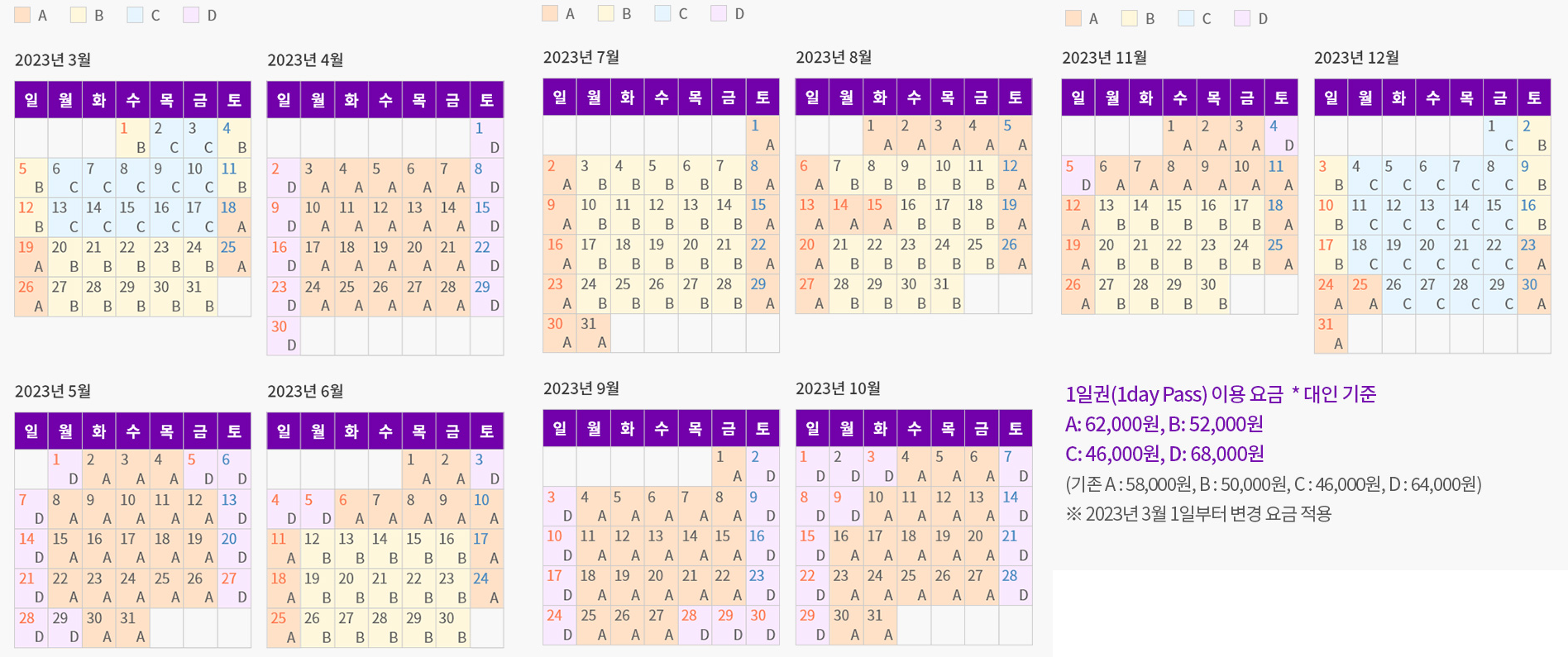A성수기, B준성수기, C비수기, D극성수기를 가르키는 가격이며, 2023년 3월~12월 까지 시즌별 캘린더를 공유 드리오니 위의 사진을 참고하시어 언제가 극성수기일지 언제가 비수기일지 확인 하시고 에버랜드 사정에 따라 일부 변경 될수 있사오니 위의 바로가기에서 참고 하시기 바랍니다.